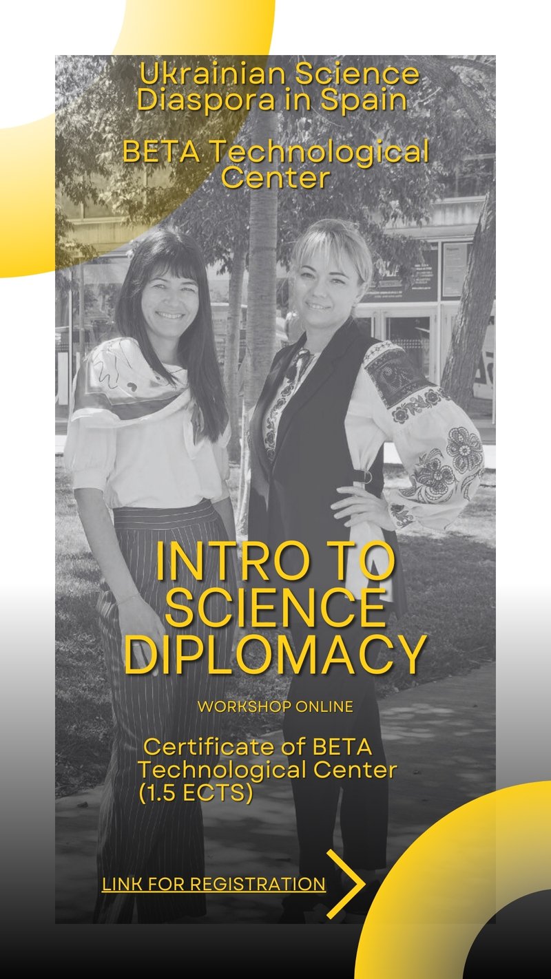 Міжнародний онлайн-воркшоп “Вступ до наукової дипломатії” (Intro to Science Diplomacy) відбудеться 21–22 жовтня 2025 року. Подія організована Українською науковою діаспорою в Іспанії та BETA Technological Center (UVIC-UCC) у співпраці з Київською школою економіки за підтримки МОН України, Іспанського фонду науки і технологій (FECYT), Мережі асоціацій іспанських дослідників та науковців за кордоном RAICEX, Політехнічного університету Валенсії Universitat Politècnica de València, Українською науковою діаспорою ScienceForUkraine та спільнотою Science at Risk.