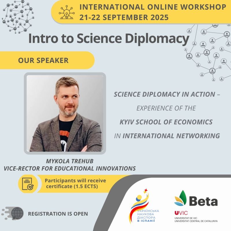 Одним із спікерів заходу стане Микола Трегуб – представник Київської школи економіки (Kyiv School of Economics). Завдяки своєму досвіду у сфері міжнародних проєктів та розвитку академічних партнерств, він поділиться практичними підходами до того, як наукова дипломатія може сприяти розбудові міжнародної співпраці, зміцненню академічних зв’язків та інтеграції України у світову наукову спільноту.