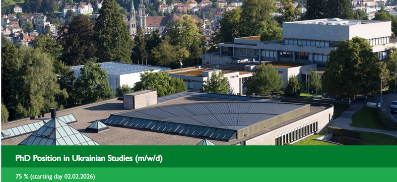 University of St. Gallen (HSG, Switzerland) оголосив набір на PhD Position in Ukrainian Studies (m/w/d). Посада фінансована на рівні 75 % ставки, початок навчання заплановано на 2 лютого 2026 року.