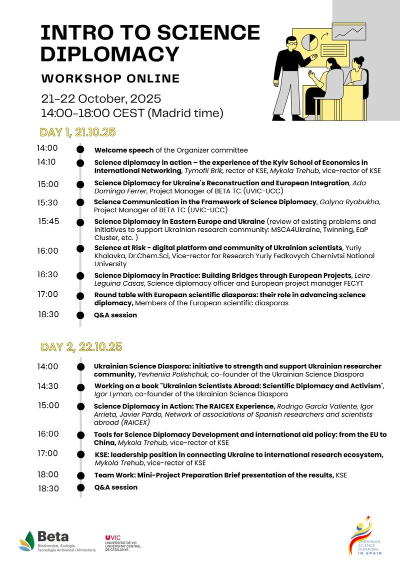 Учасники дізнаються про ключові інструменти наукової дипломатії, роль науки у відбудові України та інтеграції до ЄС, а також розвинуть практичні навички міжнародної наукової комунікації. Серед спікерів – представники представники мережі наукової дипломатії ЄС та України.